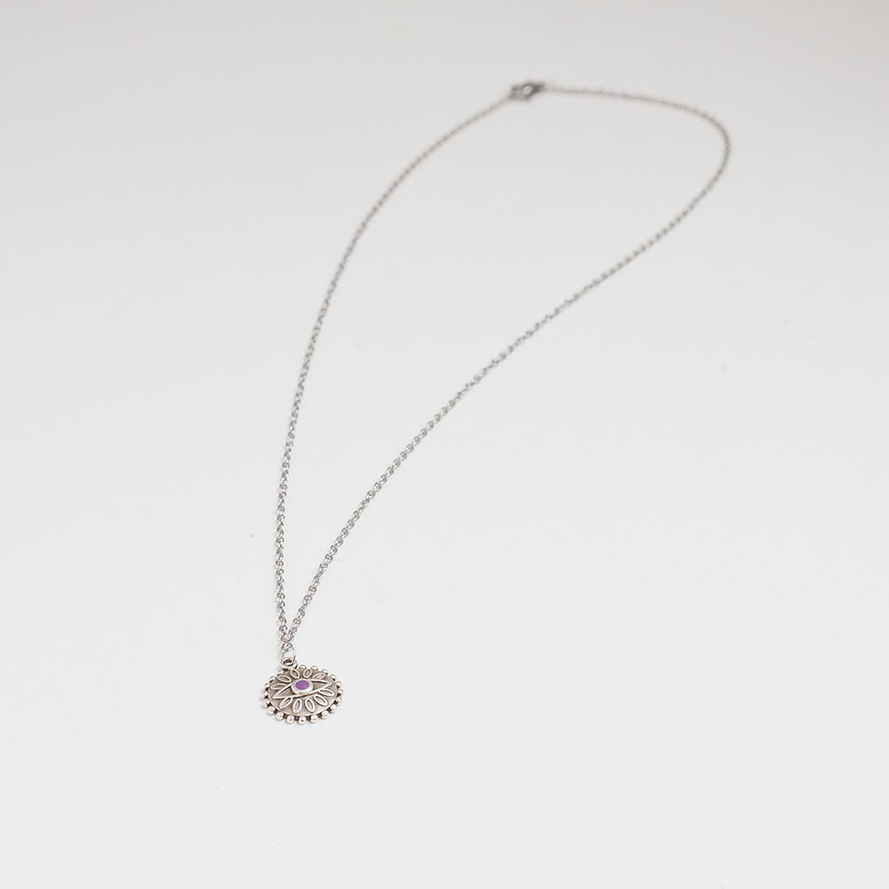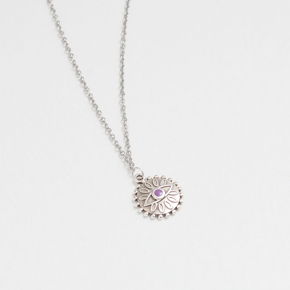 Ένα κολιέ με ατσάλινη αλυσίδα και μεταλλικό στοιχείο λουλούδι που στο κέντρο του διακοσμείται με ένα μάτι με σμάλτο προσθέτοντας μια διακριτική αλλά εκλεπτυσμένη πινελιά στο κομψό και μοντέρνο design.