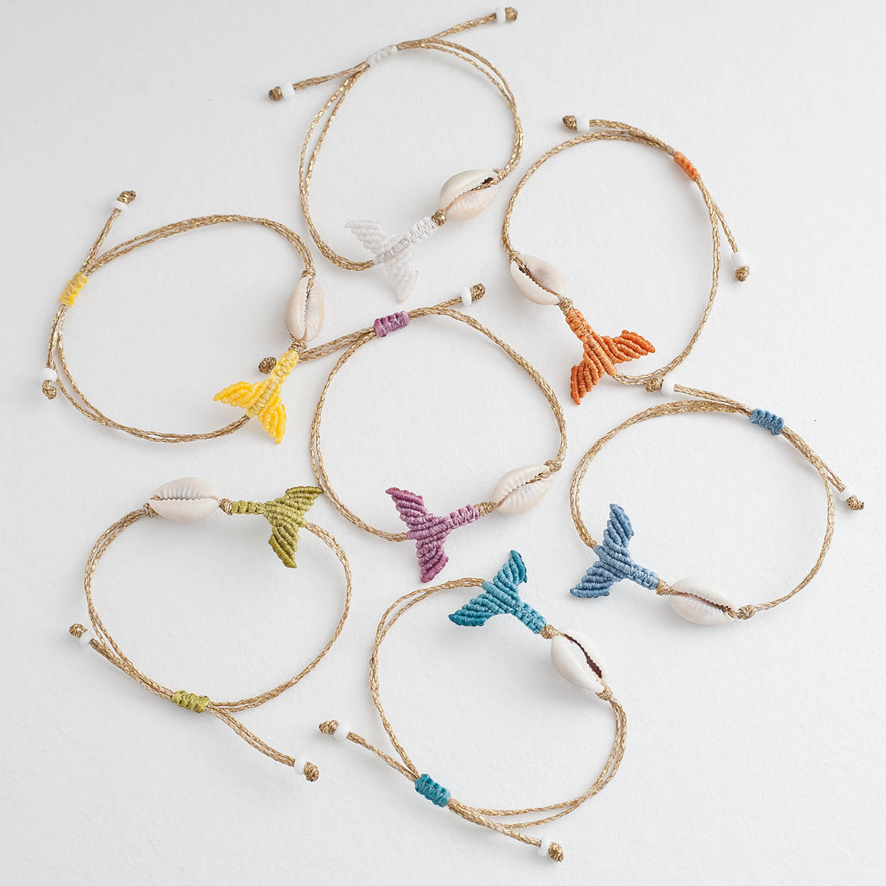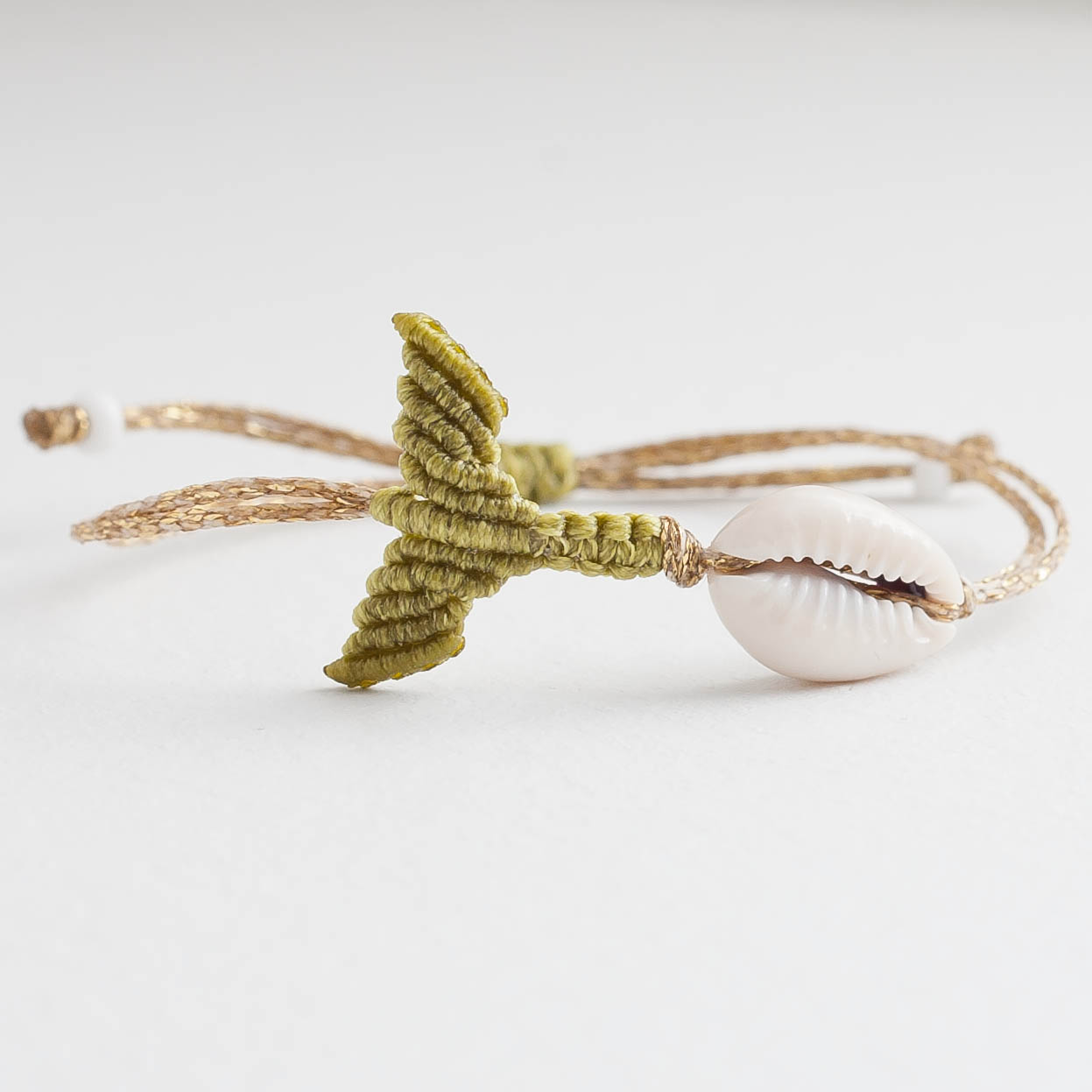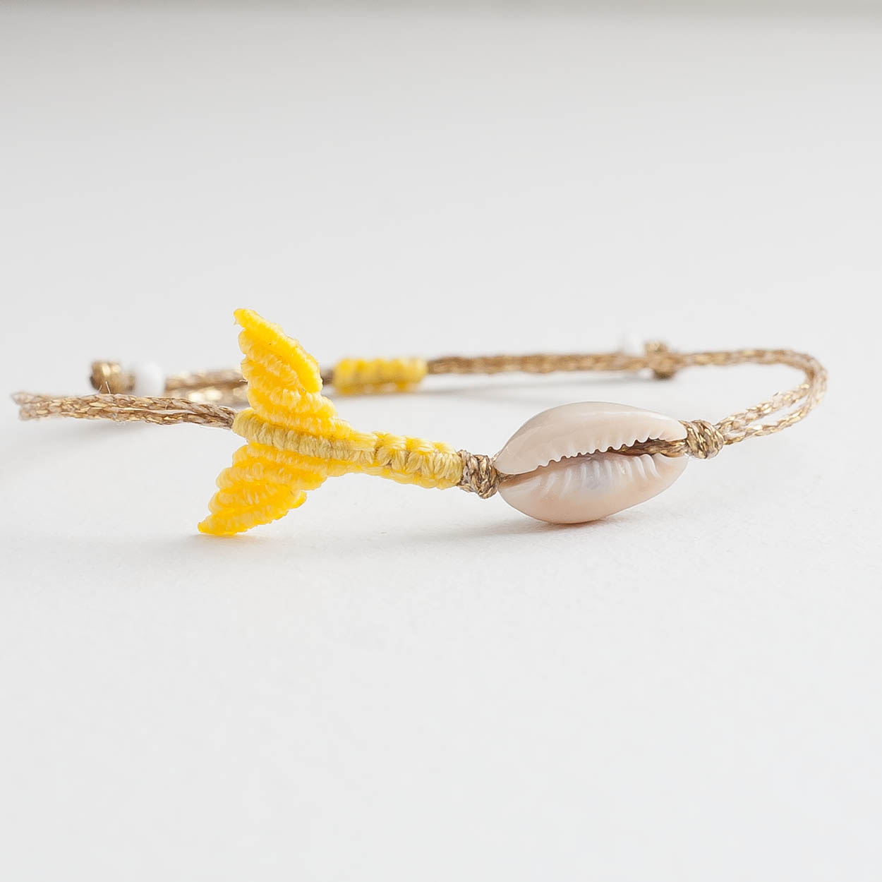 Χειροποίητο μακραμέ βραχιόλι ουρά ψαριού σε διάφορα χρώματα με κοχύλι σε κερωμένο χρυσό νήμα.